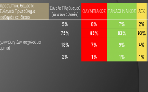 Απάντηση σοκ για το "καθαρό και δίκαιο" ποδόσφαιρο με το 75% των ερωτηθέντων να δίνει αρνητική απάντηση και μόνο το 5% θετική. Στους οπαδούς των κομμάτων τα αρνητικά ποσοστά μεγαλώνουν: 83% "δεν είναι καθαρό" για τους οπαδούς Ολυμπιακού, Παναθηναϊκού και ΠΑΟΚ και 93% για τους οπαδούς της ΑΕΚ, που εμφανίζονται περισσότεροι προβληματισμένοι και σε άλλες ερωτήσεις.