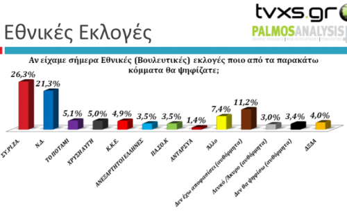 Η έρευνα της Palmos Analysis πραγματοποιήθηκε πανελλαδικά από τις 19 έως τις 22 Δεκεμβρίου σε δείγμα 1.019 ψηφοφόρων.
