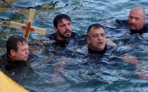 Το δριμύ ψύχος δεν εμπόδισε περίπου 30 τολμηρούς βουτηχτές στο Ηράκλειο Κρήτης, μεταξύ των οποίων και παιδιά, που έπεσαν στα παγωμένα νερά του λιμανιού για να ανασύρουν τον τίμιο σταυρό.
