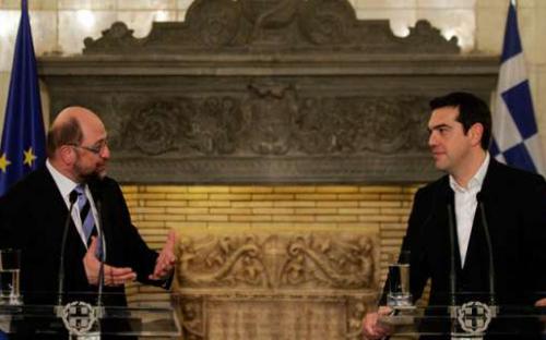 Με τον πρόεδρο του Ευρωπαϊκού Κοινοβουλίου Μάρτιν Σουλτς συναντήθηκε ο πρωθυπουργός Αλέξης Τσίπρας, την Πέμπτη στο Μέγαρο Μαξίμου. Όπως δήλωσαν και οι δύο στη συνέντευξη Τύπου υπάρχει συμφωνία για διάλογο για μια “αμοιβαία επωφελή λύση”, ενώ ο Μάρτιν Σούλτς υπογράμμισε πως οι προτάσεις της νέας κυβέρνησης για την οικονομία θα παρουσιαστούν την Παρασκευή και θα συζητηθούν με τον πρόεδρο του Eurogroup, Γερούν Ντάισλεμπλουμ.