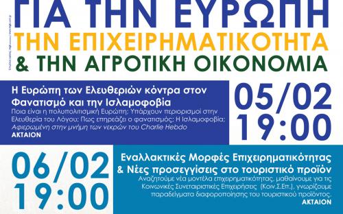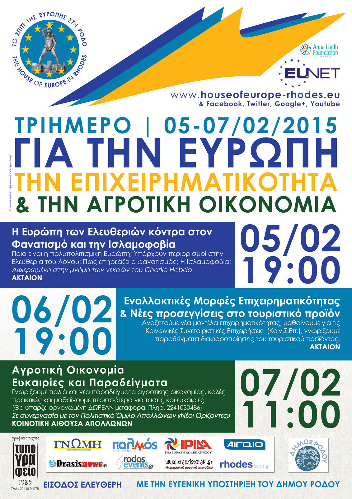 Το Σπίτι της Ευρώπης στη Ρόδο διοργανώνει για τρίτη συνεχόμενη χρονιά μία σειρά τριών μοναδικών εκδηλώσεων με γενικό τίτλο: "Τριήμερο για την Ευρώπη, την Επιχειρηματικότητα και την Αγροτική Οικονομία", στις 5-7 Φεβρουαρίου 2015.