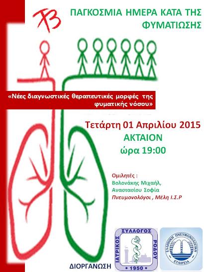 Ο Ιατρικός Σύλλογος Ρόδου στα πλαίσια ενημέρωσης και ευαισθητοποίησης των μελών του, σε συνεργασία με την Ελληνική Πνευμονολογική Εταιρεία διοργανώνουν ομιλία με θέμα τις νέες διαγνωστικές και θεραπευτικές μορφές της φυματικής νόσου.