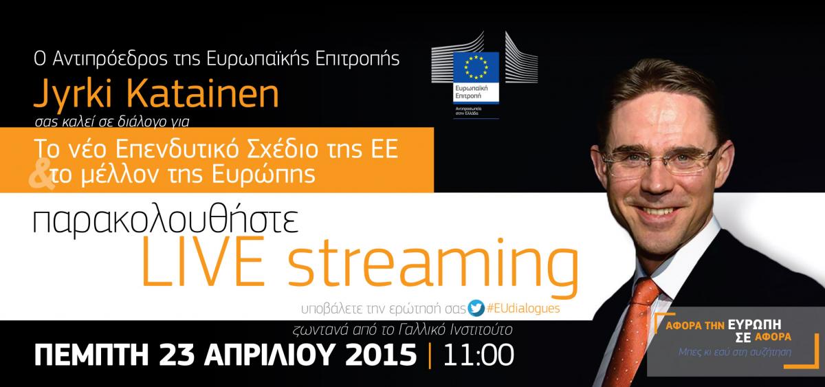 Στις 23 Απριλίου 2015, ο Αντιπρόεδρος της Ευρωπαϊκής Επιτροπής κ. Γίρκι Κατάινεν, υπεύθυνος για την Απασχόληση, την Ανάπτυξη, τις Επενδύσεις και την Ανταγωνιστικότητα, θα συνομιλήσει με φοιτητές, εκπροσώπους φορέων και παραγωγικών τάξεων και μέλη κοινωνικών οργανώσεων για το νέο επενδυτικό σχέδιο της ΕΕ, ύψους 315 δισεκατομμυρίων ευρώ. Το σχέδιο παρουσίασε, αμέσως μετά την ανάληψη των καθηκόντων του, ο Πρόεδρος της Ευρωπαϊκής Επιτροπής Ζαν - Κλοντ Γιούνκερ με στόχο την επανεκκίνηση της οικονομικής ανάπτυξης και τη μείωση της ανεργίας στην Ευρώπη.