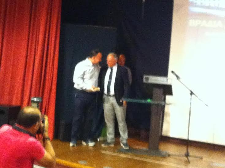 (Λεζάντα: Με τον διευθύνοντα σύμβουλο του Κολλεγιου Ροδου κ. Κώστα Αντωνιάδη όπου απονεμήθηκε πλακέτα και ο θυρεος του Ιδρυματος για τον 'αφανή ήρωα κ. Ιωάννη Παππά και για την βοήθειά του στο να βελτιωθεί η εκπαίδευση στα νησιά μας και να προσπεραστούν οι χρονιες αγκυλώσεις των στελεχών του υπουργείου Παιδειας).