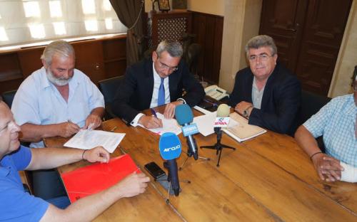 Την Προγραμματική Σύμβαση μεταξύ της Περιφέρειας Νοτίου Αιγαίου και της ΕΤΑΙΠΡΟΦΥΚΑ, η οποία επαναλειτουργεί από σήμερα, συνυπέγραψαν ο Περιφερειάρχης κ. Γιώργος Χατζημάρκος και ο Πρόεδρος της Εταιρείας κ. Αγαπητός Παλλάς, το πρωί της Δευτέρας στο γραφείο του Περιφερειάρχη, παρόντων του Αντιπεριφερειάρχη κ. Φιλήμονα Ζαννετίδη, του Εντεταλμένου Περιφερειακού Συμβούλου κ. Χρήστου Ευστρατίου και του Περιφερειακού Συμβούλου κ. Μιχάλη Μπαριανάκη.