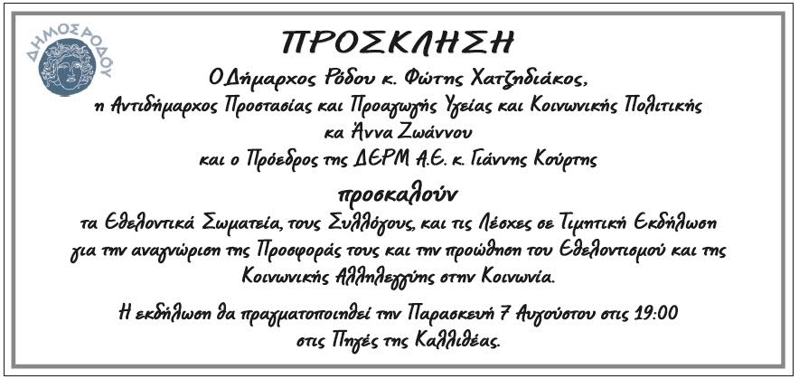 ΔΗΜΟΣ ΡΟΔΟΥ - Τιμητική εκδήλωση για εθελοντικά σωματεία