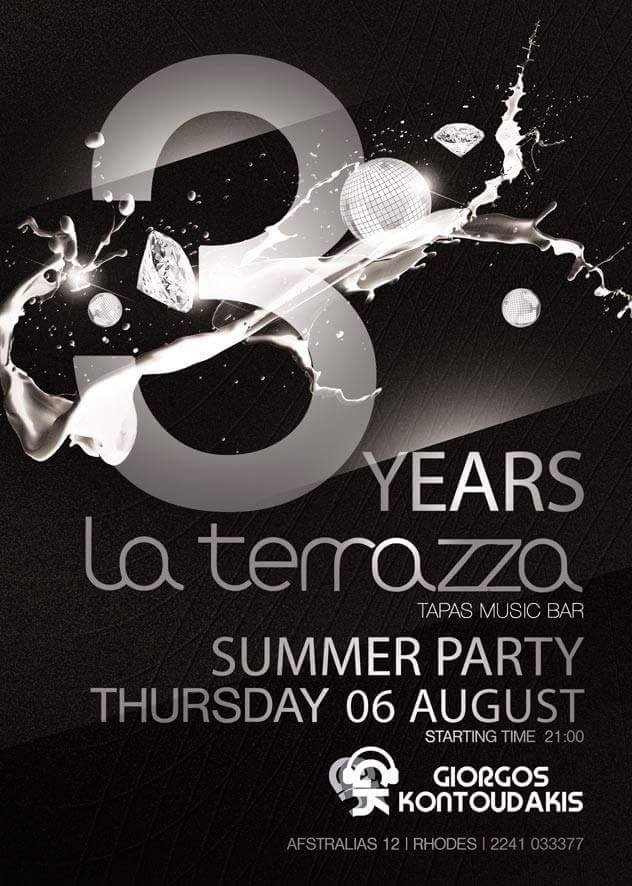 ΡΟΔΟΣ - ΣΤΟ LA TERRAZZA ΓΙΟΡΤΑΖΟΥΜΕ TA 3α ΜΑΣ ΓΕΝΕΘΛΙΑ! ΤΗΝ ΠΕΜΠΤΗ 6 ΑΥΓΟΥΣΤΟΥ 2015 ΣΤΙΣ 9.00 ΤΟ ΒΡΑΔΥ! ΜΕ ΚΕΦΙ, ΜΟΥΣΙΚΗ, ΠΟΤΟ, ΑΠΙΣΤΕΥΤΕΣ ΓΕΥΣΕΙΣ ΚΑΙ ΘΕΑ ΠΟΥ ΚΟΒΕΙ ΤΗΝ ΑΝΑΣΑ! Η ΚΑΛΥΤΕΡΗ ΠΡΟΤΑΣΗ ΓΙΑ ΑΥΡΙΟ ΤΟ ΒΡΑΔΥ!