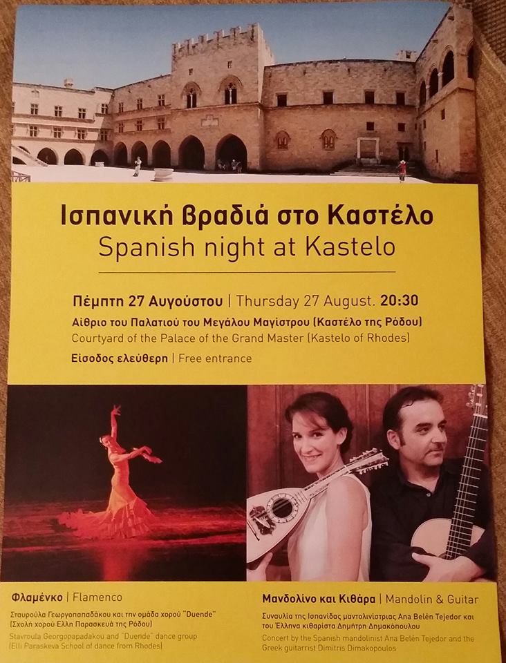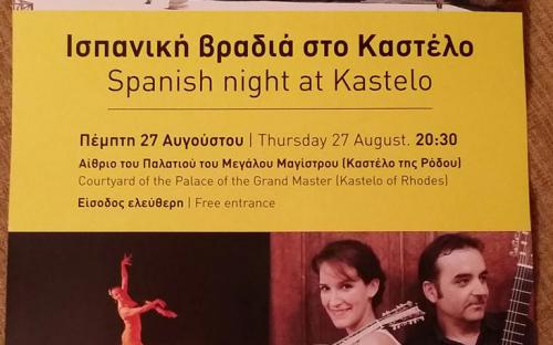 Την Πέμπτη 27 Αυγούστου και ώρα 20.30 στο Παλάτι του Μεγάλου Μαγίστρου, η Ισπανική Πρεσβεία και το αντίστοιχο Προξενείο Ρόδου - Δωδεκανήσου,διοργανώνουν βραδιά Ισπανικής κουλτούρας, με θέαμα φλαμένγκο και κονσέρτο - μαντολίνο και κιθάρα. Η είσοδος για το κοινό, θα είναι ελεύθερη.