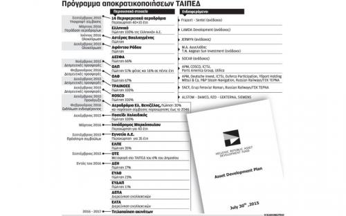 Σύμφωνα με το εν λόγω σχέδιο αξιοποίησης του χαρτοφυλακίου του ΤΑΙΠΕΔ προβλέπεται μέχρι τον Νοέμβριο να αποφασιστεί μοντέλο πώλησης του 35% που ελέγχει το Ταμείο Ιδιωτικοποιήσεων (ΤΑΙΠΕΔ) στα Ελληνικά Πετρέλαια είτε σε στρατηγικό επενδυτή είτε μέσω επιταχυνόμενου βιβλίου προσφορών. Επίσης προβλέπεται έως τα τέλη Οκτωβρίου να έχει αποφασιστεί το ποσοστό του ΟΤΕ που ελέγχει ακόμα το Δημόσιο και θα περάσει (10% μαζί με το ΙΚΑ) στο ΤΑΙΠΕΔ με σκοπό να αξιοποιηθεί ενδεχομένως μέσω πώλησης στην Deutsche Telekom. Στο εν λόγω σχέδιο υπάρχει ακόμα η πώληση του 23% της ΕΥΑΘ και του 11% της ΕΥΔΑΠ (μετά την απόρριψη από το ΣτΕ της διάθεσης πλειοψηφικού ποσοστού) σε απροσδιόριστη όμως ημερομηνία. Περιλαμβάνεται επίσης η πώληση του 17% του μετοχικού κεφαλαίου της ΔΕΗ που βρίσκεται στο χαρτοφυλάκιο του ΤΑΙΠΕΔ. Αλλά και η υιοθέτηση στρατηγικής μετά από εισηγήσεις συμβούλων του Ταμείου για τη διαδικασία αξιοποίησης του ΑΔΜΗΕ όπως και το άνοιγμα της αγοράς λιανικής έως τα τέλη του 2016. Ακόμα στο Asset Development Plan γίνεται λόγος για αναδιάρθρωση των ΕΛΤΑ ώστε να επιστρέψουν σε κερδοφορία και να υπολογιστούν οι χρηματοδοτικές τους ανάγκες αλλά όχι για πώληση αν και αναφέρεται πως θα ληφθούν αποφάσεις για τη στρατηγική αξιοποίησης μετά και την εισήγηση των συμβούλων του ΤΑΙΠΕΔ (PWC και Lazard).