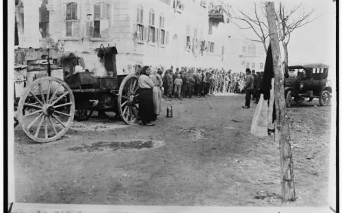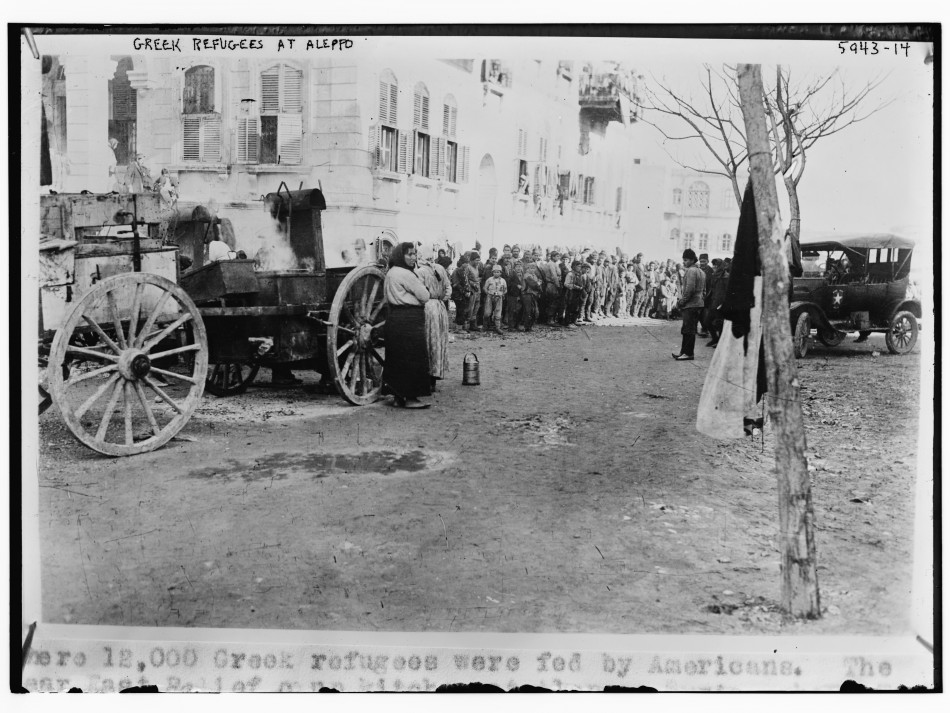 Τότε, 17.000 εξαθλιωμένοι Έλληνες κατέφθασαν στις μεγάλες Συριακές πόλεις για να εγκατασταθούν, πρόσκαιρα ή και μόνιμα. Στη λεζάντα της φωτογραφίας, που προφανώς εικονίζει μια σκηνή συσσιτίου, αναγράφεται ότι οι Αμερικανοί σίτισαν 12.000 Έλληνες".