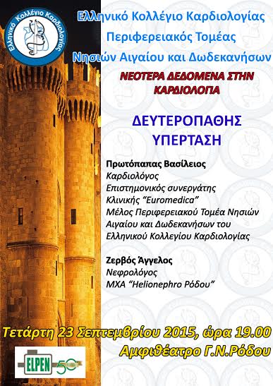 ΝΕΟΤΕΡΑ ΔΕΔΟΜΕΝΑ ΣΤΗΝ ΚΑΡΔΙΟΛΟΓΙΑ : ΔΕΥΤΕΡΟΠΑΘΗΣ ΥΠΕΡΤΑΣΗ, Τετάρτη 23.09.2015 στο ΓΝΡ
