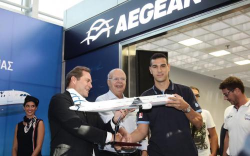 Φωτο 4. Ο Αντιπρόεδρος της AEGEAN, κ. Ευτύχιος Βασιλάκης, προσφέρει στον Πρόεδρο της ΕΟΚ, κ. Γιώργο Βασιλακόπουλο και στον αρχηγό της Εθνικής Ομάδας, κ . Νίκο Ζήση ένα μοντέλο αεροσκάφους της AEGEAN |