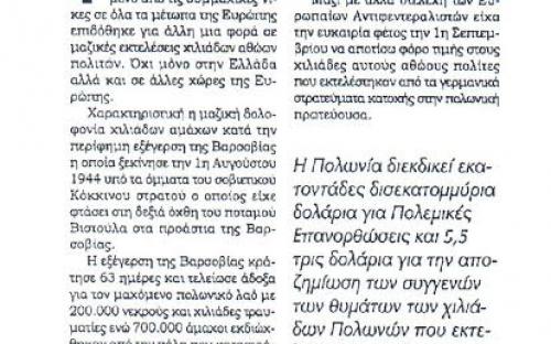 Ήδη στην Πολωνία έχει αρχίσει να διαμορφώνεται ένα σημαντικό κίνημα διεκδίκησης αποζημιώσεων από τη Γερμανία για τις εκτελέσεις όχι μόνο των χιλιάδων κατοίκων της Βαρσοβίας και άλλων περιοχών της χώρας αλλά και για την ολική καταστροφή των υποδομών και της οικονομίας της χώρας από τα εκεί γερμανικά στρατεύματα κατοχής,