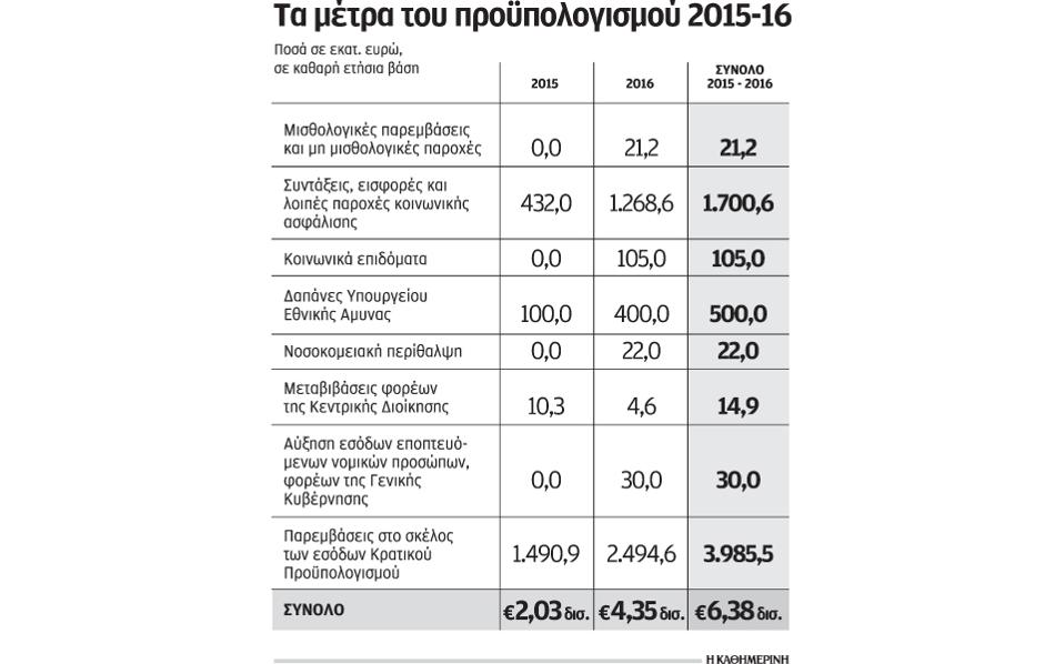 Τα μέτρα των 4,35 δισ. ευρώ έχουν ήδη ψηφιστεί στο πλαίσιο του νέου Μνημονίου (συνολικά στη διετία 2015-2016 το ποσό αυξάνεται στα 6,38 δισ. ευρώ). Ωστόσο, στο Πρόγραμμα προβλέπεται και η λήψη νέων μέτρων που θα πρέπει να περιληφθούν στο επικαιροποιημένο Μεσοπρόθεσμο Πρόγραμμα και στο τελικό κείμενο του προϋπολογισμού του 2016 που θα είναι έτοιμο τον Νοέμβριο. Πάντως, από το υπουργείο Οικονομικών ανέφεραν χθες πως η κυβέρνηση κατέβαλε «προσπάθεια να αξιοποιηθεί ο δημοσιονομικός χώρος που εξασφαλίστηκε μετά από σκληρές διαπραγματεύσεις με τους δανειστές» και ότι το προσχέδιο του προϋπολογισμού «αποτυπώνει τις κυβερνητικές προτεραιότητες για κοινωνική δικαιοσύνη και δημοσιονομική υπευθυνότητα».