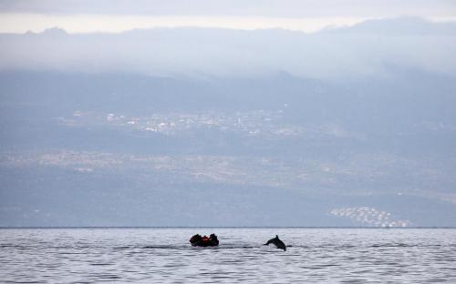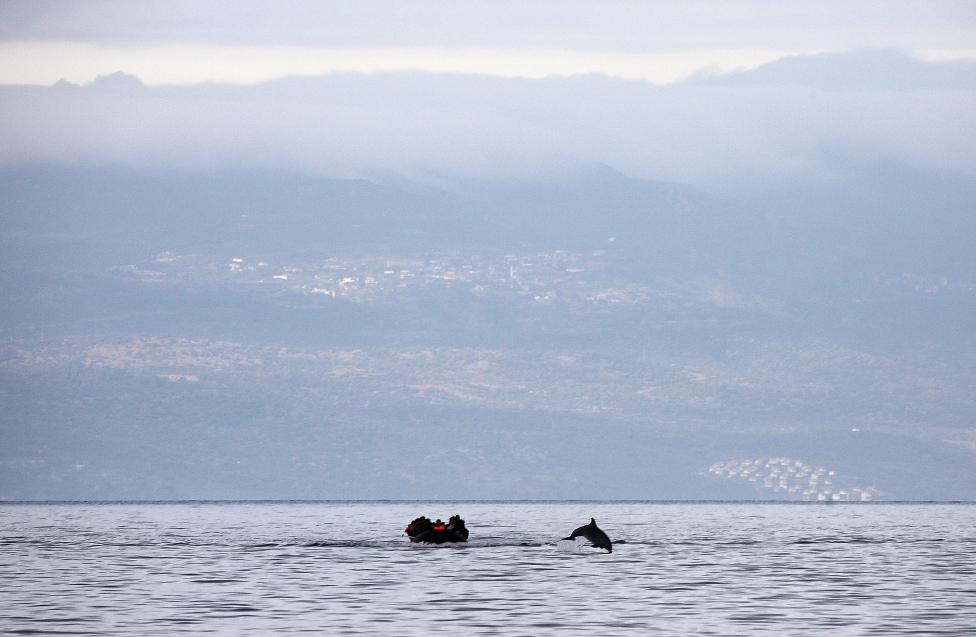 Ένα δελφίνι πηδά τα κύματα μπροστά σε ένα πλωτό σκάφος γεμάτο πρόσφυγες από τη Συρία. Έρχονται από την Τουρκία, που φαίνεται στο φόντο, και προσπαθούν να φτάσουν στη Λέσβο. Μια εκπληκτική φωτογραφία του Γιάννη Μπεχράκη για το Reuters.
