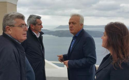Τελικός προορισμός της περιοδείας του περιφερειάρχη η Σαντορίνη όπου και θα παραμείνει ως την Τρίτη το βράδυ, ημέρα διεξαγωγής του Περιφερειακού Συμβουλίου. Το πρωί της Κυριακής ο κ. Χατζημάρκος επισκέφθηκε την Ένωση Συνεταιρισμών Σαντορίνης SANTO WINES και συναντήθηκε με τον Πρόεδρό του κ. Μάρκο Καφούρο, παρόντων του δημάρχου κ. Νίκου Ζώρζου και των δύο αντιπεριφερειαρχών. Ακολούθησε ξενάγηση στο οινοποιείο και συζήτηση για τα θέματα του πρωτογενή τομέα.