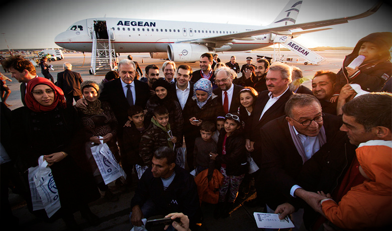 Σε ειδική τελετή που πραγματοποιήθηκε στο αεροδρόμιο Ελ.Βενιζέλος, τους πρόσφυγες συνόδεψαν ο πρωθυπουργός Αλέξης Τσίπρας, ο πρόεδρος του Ευρωκοινοβουλίου Μάρτιν Σουλτς και ο υπουργός Εξωτερικών του Λουξεμβούργου Ζαν Ασελμπορν. Στην εκδήλωση στο αεροδρόμιο παρευρέθηκαν επίσης, ο Επίτροπος Δημήτρης Αβραμόπουλος και ο αναπληρωτής Υπουργός για τη μεταναστευτική πολιτική Γιάννης Μουζάλας.