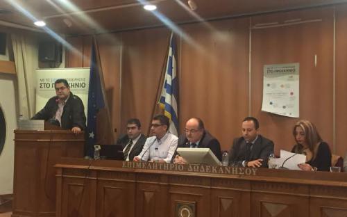 Ο Αντιπεριφερειάρχης Δωδεκανήσου κ. Χαράλαμπος Κόκκινος παρέστη στην εκδήλωση που διοργάνωσε στη Ρόδο το Επιμελητήριο Δωδεκανήσου με το Ι.Μ.Ε. Γ.Σ.Β.Ε.Ε. (Ινστιτούτο Μικρών Επιχειρήσεων - Γενική Συνομοσπονδία Επαγγελματιών Βιοτεχνών Εμπόρων Ελλάδος) παρουσία του προέδρου της Γ.Σ.Β.Ε.Ε. κ. Γιώργου Καββαθά και του κ. Γιάννη Πάππου, προέδρου του Εμπορικού Επιμελητηρίου Δωδεκανήσου το βράδυ της 9.11.2015 με θέμα «Τοπική Ανάπτυξη με αύξηση της απασχόλησης και τις Μικρομεσαίες Επιχειρήσεις στο Επίκεντρο - Ο Ρόλος της Ομοσπονδίας Επαγγελματιών Βιοτεχνών Εμπόρων Ν. Δωδεκανήσου».