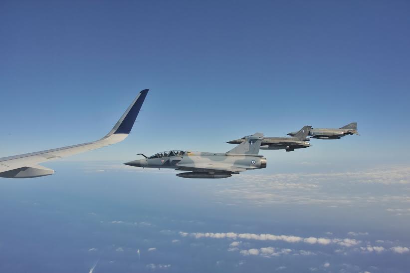 Έτσι την Παρασκευή 6 Νοεμβρίου, αμέσως μετά την απογείωση από τον ΔΑΑ του Αirbus A320ceo της AEGEAN και κατά τη διάρκεια της πτήσης, ο εκπρόσωπος της Π.Α., Σμήναρχος (Ι) Δημοσθένης Γρηγοριάδης, αφού εξήγησε στους επιβάτες ορισμένα τεχνικά στοιχεία για την όλη διαδικασία, ενημέρωνε δια μικροφώνου τους τυχερούς επιβάτες για τα τρία μαχητικά αεροσκάφη που πετούσαν δίπλα τους και τους σχηματισμούς που έκαναν. Συγκεκριμένα στην στρατιωτική περιοχή ασκήσεων της Π.Α. Βορείως της Μυκόνου και μέχρι την 114 Πτέρυγα Μάχης στην Αεροπορική Βάση της Τανάγρας, έγινε ένας μοναδικός σχηματισμός που αποτελείτο από ένα ολοκαίνουργιο επιβατικό αεροσκάφοςAirbus A320ceo με πιλότους τους κυβερνήτες της AEGEAN (και απόστρατους ιπτάμενους της Π.Α.) Αντισμήναρχο (ε.α) Ευστράτιο Ρέντζο και Αντισμήναρχο (ε.α.) Αναστάσιο Οικονόμου, ένα μαχητικό Mirage 2000-5 Mk.2, ένα F-16D Block.52+, καθώς και ένα F-4E “Peace Ikarus 2000”, της Πολεμικής Αεροπορίας. Αξίζει να σημειωθεί ότι στα τρία διθέσια μαχητικά, επέβαιναν ως backseaters (συγκυβερνήτες) ισάριθμοι απόστρατοι πιλότοι της Πολεμικής Αεροπορίας.