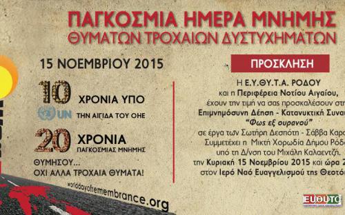 Η ΕΥΘΥΤΑ ΡΟΔΟΥ και η Περιφέρεια Νοτίου Αιγαίου, σας καλούν όλους, για μια ΖΩΗ χωρίς φόβο.. για μια ΖΩΗ.. χωρίς τροχαία θύματα… για μια πόλητη Ρόδο για τη ΖΩΗ, και ένα κυκλοφοριακό δίκτυο που δεν θα παράγει το θάνατο και την αναπηρία και πρώτα απ όλα τις οικογένειες των θυμάτων και τα ίδια τα θύματα των αναρίθμητων τροχαίων δυστυχημάτων-εγκλημάτων, να είστε κοντά μας, την Κυριακή στις 15 Νοεμβρίου 2015, στην Επιμνημόσυνη Δέηση-Κατανυκτική Συναυλία «Φως εξ Ουρανού» σε έργα των Σωτήρη Δεσπότη-Σάββα Καρατζιά. Συμμετέχει η Μικτή Χορωδία Δήμου Ρόδου υπό τη Διεύθυνση του Μιχάλη Καλαεντή, στον Ιερό Ναό του Ευαγγελισμού της Θεοτόκου στις 8μμ..www.efthita.gr