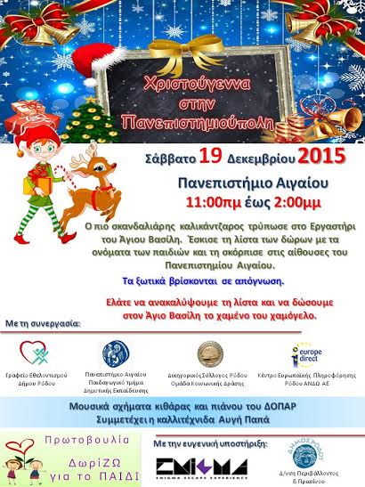 Σκοπός της εκδήλωσης είναι να φέρει τους μικρούς φίλους μέσα στο χώρο του Πανεπιστημίου Αιγαίου. Θα σχηματίζονται ομάδες παιδιών, οι οποίες με συνοδεία ξωτικών και βοηθών του Άγιου Βασίλη, θα κινούνται στις αίθουσες διδασκαλίας και στα εργαστήρια του Πανεπιστημίου. Σε κάθε αίθουσα θα υπάρχει ένας γρίφος, που με τη λύση του η κάθε ομάδα θα αποκτά ένα κομμάτι της λίστας. Όταν συγκεντρωθούν όλα τα κομμάτια της λίστας, οι ομάδες θα φτάνουν στο τέρμα της διαδρομής, στην αίθουσα χορού του Πανεπιστημίου. Η εκδήλωση θα πλαισιωθεί μουσικά από σπουδαστές των τμημάτων κιθάρας και πιάνου του ΔΟΠΑΡ με τη συμμετοχή της καλλιτέχνιδας Αυγής Παπά. Θα προσφέρεται ένα συμβολικό δώρο στα παιδιά από τη Διεύθυνση Περιβάλλοντος και Πρασίνου του Δήμου Ρόδου.