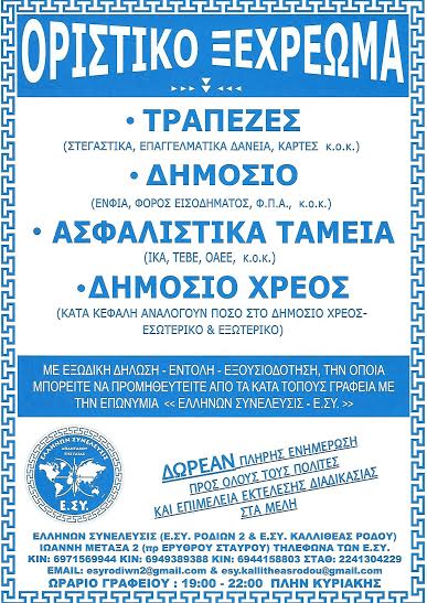 ΕΛΛΗΝΩΝ ΣΥΝΕΛΕΥΣΙΣ ΡΟΔΙΩΝ 2 "Πήρης αποπληρωμή και οριστική απαλλαγή των πολιτών από οφειλές προς Τράπεζες, Εφορία, Δημόσια Ταμεία, κλπ."