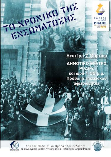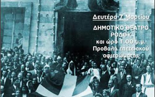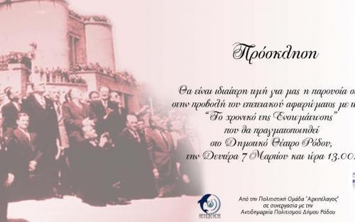 "Το Χρονικό της Ενσωμάτωσης" , στο Δημοτικό Θέατρο Ρόδου, την Δευτέρα - 7 Μαρτίου και ώρα 13.00 μετά την παρέλαση.