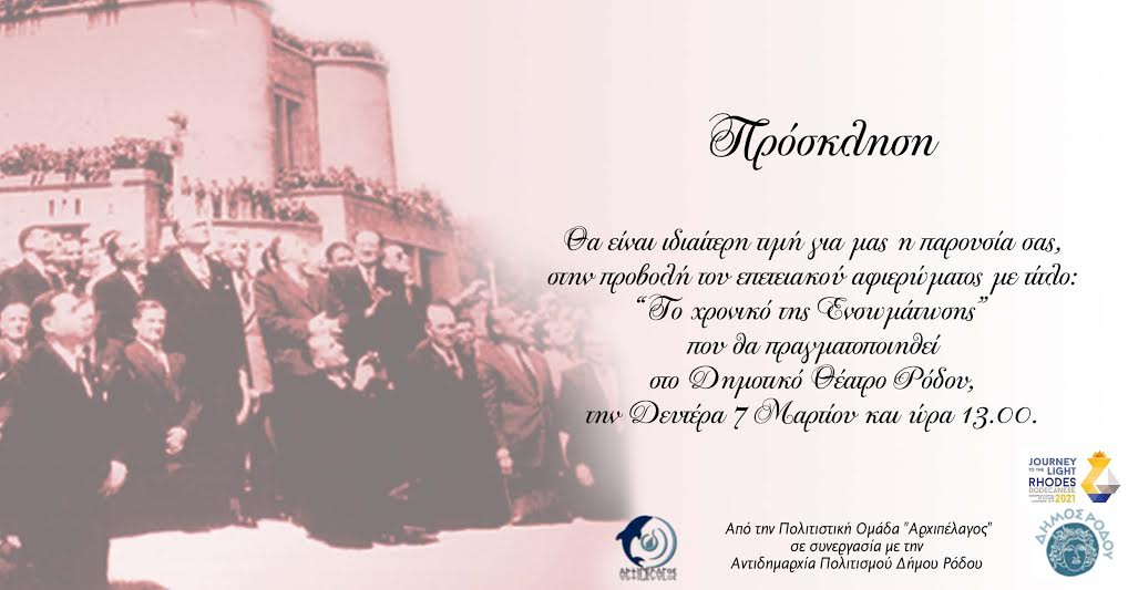 Η Πολιτιστική Ομάδα "Αρχιπέλαγος", σε συνεργασία με τον Δήμο Ρόδου (Αντιδημαρχία Πολιτισμού), στο πλαίσιο της προσπάθειάς τους για την ανάδειξη του Πολιτισμού και της Ιστορίας των Δωδεκανήσων, θα προβάλει το επετειακό αφιέρωμα με τίτλο