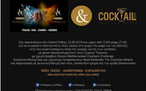 Με ιδιαίτερη χαρά, τα στελέχη και οι εργαζόμενοι της εταιρείας Coffeeplus και Cocktailplus, σας προσκαλούν στο Casino της Ρόδου, την Τρίτη 22 Μαρτίου 2016, από 12.00 μέχρι 21.00 μ.μ. προκειμένου να γνωρίσετε από κοντά, τις νέες τάσεις στον συγκλονιστικό χώρο του καφέ και την εξέλιξη στην αναπτυσσόμενη τάση των Cocktails.
