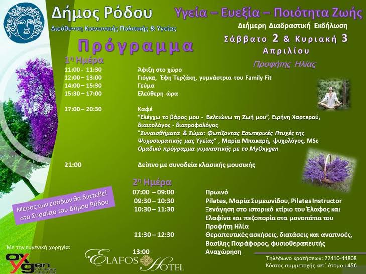 Ο Δήμος Ρόδου με τη Διεύθυνση Κοινωνικής Πολιτικής & Υγείας έχει τη χαρά να σας προσκαλέσει στη 2η Διήμερη Διαδραστική Εκδήλωση με τίτλο «Υγεία – Ευεξία – Ποιότητα Ζωής» που θα πραγματοποιηθεί το Σάββατο 2 και την Κυριακή 3 Απριλίου στο ξενοδοχείο Έλαφος στον Προφήτη Ηλία. Η διημερίδα θα πραγματοποιηθεί με τη μέριμνα της κ. Άννας Ζωάννου, Αντιδήμαρχο Προστασίας και Προαγωγής Υγείας, Κοινωνικής Πολιτικής, Ισότητας των φύλων και τρίτης ηλικίας.