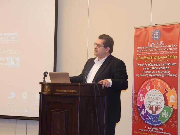 Ο Αντιπεριφερειάρχης Δωδεκανήσου κ. Χ. Κόκκινος ανταποκρινόμενος σε επίσημη τιμητική πρόσκληση και εκπροσωπώντας την Περιφερειακή Ενότητα Δωδεκανήσου, συμμετείχε στο 2ο Πανελλήνιο Επιστημονικό Συνέδριο με συμμετοχή 800 συνέδρων από την Ελλάδα και το εξωτερικό του Ι.Α.Κ.Ε. (ΙΝΣΤΙΤΟΥΤΟ ΑΝΘΡΩΠΙΣΤΙΚΩΝ ΚΑΙ ΚΟΙΝΩΝΙΚΩΝ ΕΠΙΣΤΗΜΩΝ) που πραγματοποιήθηκε στις 1 - 3 Απριλίου 2016 στο Ηράκλειο Κρήτης, με θέμα: «ΤΟΠΙΚΗ ΑΥΤΟΔΙΟΙΚΗΣΗ, ΕΚΠΑΙΔΕΥΣΗ ΚΑΙ ΔΙΑ ΒΙΟΥ ΜΑΘΗΣΗ - Η ΠΑΙΔΕΙΑ ΚΑΙ Ο ΠΟΛΙΤΙΣΜΟΣ ΩΣ ΠΥΛΩΝΕΣ ΠΕΡΙΦΕΡΕΙΑΚΗΣ ΑΝΑΠΤΥΞΗΣ».