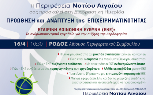 Μία επίκαιρη όσο ποτέ διαδραστική διημερίδα διοργανώνει η Περιφέρεια Νοτίου Αιγαίου για την ανάπτυξη της επιχειρηματικότητας και κυρίως την προώθησή της. Βασικός πυλώνας της διημερίδας αποτελεί η ΕΚΕ που την τοποθετεί ως το ανθρωποκεντρικό εργαλείο για την αύξηση της κερδοφορίας των επιχειρήσεων.