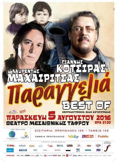 RHODES FESTIVAL 2016 ΛΑΥΡΕΝΤΗΣ ΜΑΧΑΙΡΙΤΣΑΣ – ΓΙΑΝΝΗΣ ΚΟΤΣΙΡΑΣ Τα καλύτερα τραγούδια της «Παραγγελιάς» - ΚΑΛΟΚΑΙΡΙ 2016 Παρασκευή 5 Αυγούστου 2016 Θέατρο Μεσαιωνικής Τάφρου Ώρα 21:30