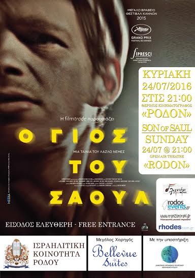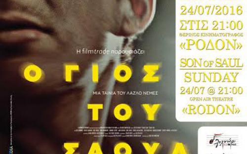 Την Κυριακή, 24 Ιουλίου 2016, στις 21:00, στο Θερινό Κινηματογράφο "Ρόδον". θα προβληθεί η πολυβραβευμένη ταινία "Ο Γιος του Σαούλ". Στο Άουσβιτς του 1944 ο Σαούλ είναι ένας από τους λίγους επιζώντες Εβραίους, ο οποίος αναγκάζεται να βοηθά τους Γερμανούς στο κάψιμο των νεκρών ομοεθνών του. Μέχρι που κάποια στιγμή αποφασίζει να θάψει το πτώμα ενός παιδιού, το οποίο ισχυρίζεται πως είναι δικό του. Μια σκληρή ιστορία επιβίωσης μετατρέπεται με συγκλονιστικό τρόπο στην απόλυτη υπαρξιακή οδύσσεια ως την καρδιά του σκοταδιού. Μεγάλο Βραβείο της Επιτροπής στις Κάνες για ένα εντελώς πρωτότυπο και τολμηρό αριστούργημα, σκηνοθετικό ντεμπούτο ενός βοηθού του Μπέλα Ταρ.