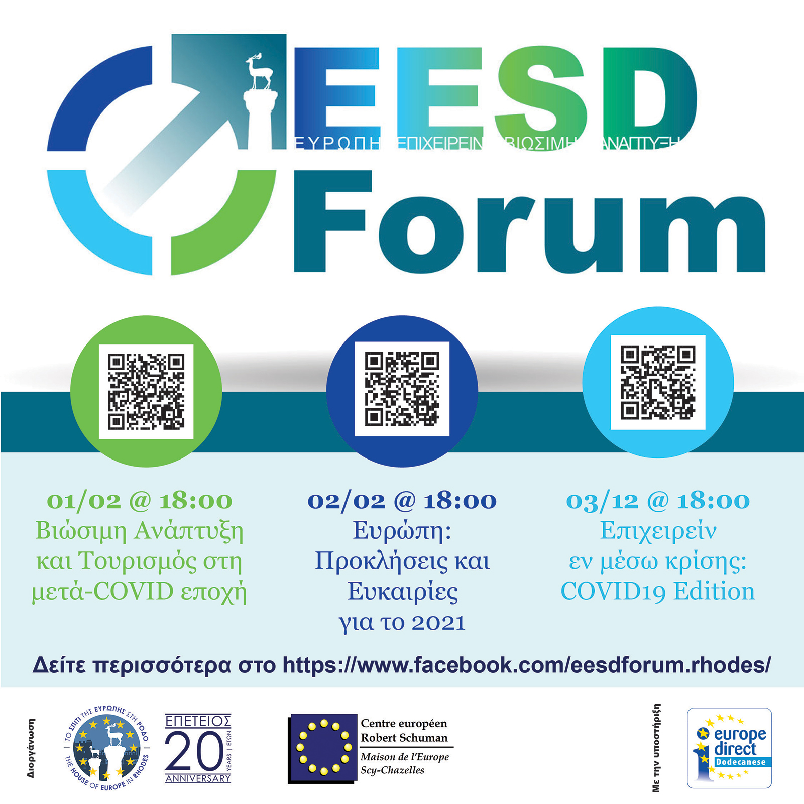 Το Europe, Entrepreneurship & Sustainable Development Forum, Rhodes, η μετεξέλιξη του γνωστού και αγαπημένου θεσμού του Σπιτιού της Ευρώπης στη Ρόδο, που ονομαζόταν «Τριήμερο για την Ευρώπη, την Επιχειρηματικότητα και τη Βιώσιμη Ανάπτυξη», επιστρέφει, αυτή τη φορά online, μετά από 7 χρόνια «φυσικής» παρουσίας. Το EESD Forum διοργανώνει το Σπίτι της Ευρώπης στη Ρόδο και το Ευρωπαϊκό Κέντρο Ρομπέρ Σουμάν (Centre Européen Robert Schuman – CERS) που εδρεύει στη Γαλλία, με την υποστήριξη του Europe Direct Δωδεκανήσου της ΑΝ.ΔΩ.