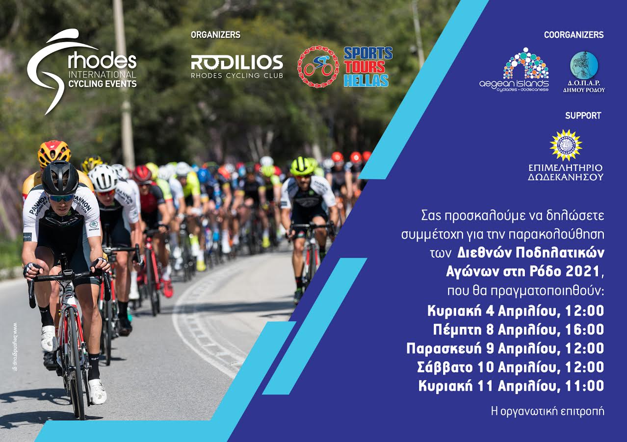 Η αντίστροφη μέτρηση, για τις μεγάλους διεθνείς ποδηλατικούς αγώνες 2021, έχει ξεκινήσει στη Ρόδο. Οι διοργανωτές πλέον μετρούν αντίστροφα για τα μεγάλα ποδηλατικά ραντεβού, που θα γίνουν στο νησί μας, στις 4, 8, 9, 10 και 11 Απριλίου. Η Rhodes International Cycling Events, o Ροδήλιος και η Sports Tours Hellas προετοιμάζονται πυρετωδώς για έναν άκρως… ποδηλατικό Απρίλιο, με διοργανώσεις που θα μείνουν χαραγμένες στη μνήμη των συμμετεχόντων. Συνδιοργανωτές είναι η Περιφέρεια Νοτίου Αιγαίου και ο Δήμος Ρόδου (Δ.Ο.Π.Α.Ρ.), με τη στήριξη του Επιμελητηρίου Δωδεκανήσου.