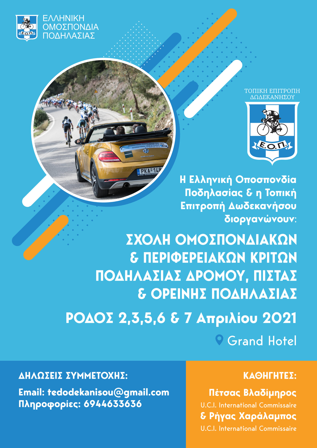 Κατά τη διάρκεια των διεθνών αγώνων ποδηλασίας, που θα γίνουν στη Ρόδο πρόκειται να πραγματοποιηθεί σχολή ομοσπονδιακών και περιφερειακών κριτών δρόμου, πίστας και ορεινής ποδηλασίας, που θα γίνει από 2 έως 7 Απριλίου 2021. Η σχολή γίνεται μετά από συντονισμένες προσπάθειες της Τ.Ε. Ποδηλασίας, στο πλαίσιο της ανάπτυξης του αθλήματος. Αναλυτικά, όλες οι λεπτομέρειες για τη σχολή, στην οποία το κόστος συμμετοχής ανέρχεται στα 50 ευρώ, ενώ καθηγητές θα είναι ο Χαράλαμπος Ρήγας και ο Βλαδίμηρος Πέτσας.