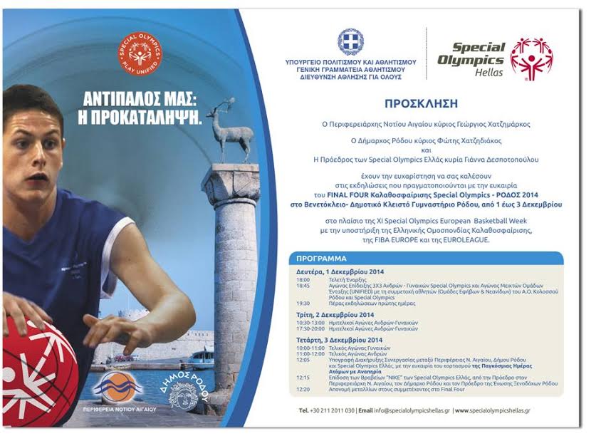 Με την υπογραφή της Διακήρυξης Συνεργασίας μεταξύ Περιφέρειας Νοτίου Αιγαίου, Δήμου Ρόδου και Special Olympics Ελλάδας, ανήμερα της 3ης Δεκεμβρίου, ημέρας καθιερωμένης ως Παγκόσμιας Ημέρας Ατόμων με Αναπηρία, έκλεισε χθες ο κύκλος των εκδηλώσεων των αγώνων του Final Four Καλαθοσφαίρισης Special Olympics – Ρόδος 2014, που διεξήχθησαν στο Βενετόκλειο, με την υποστήριξη της Ελληνικής Ομοσπονδίας Καλαθοσφαίρισης, της FIBA Europe και της Euroleague.