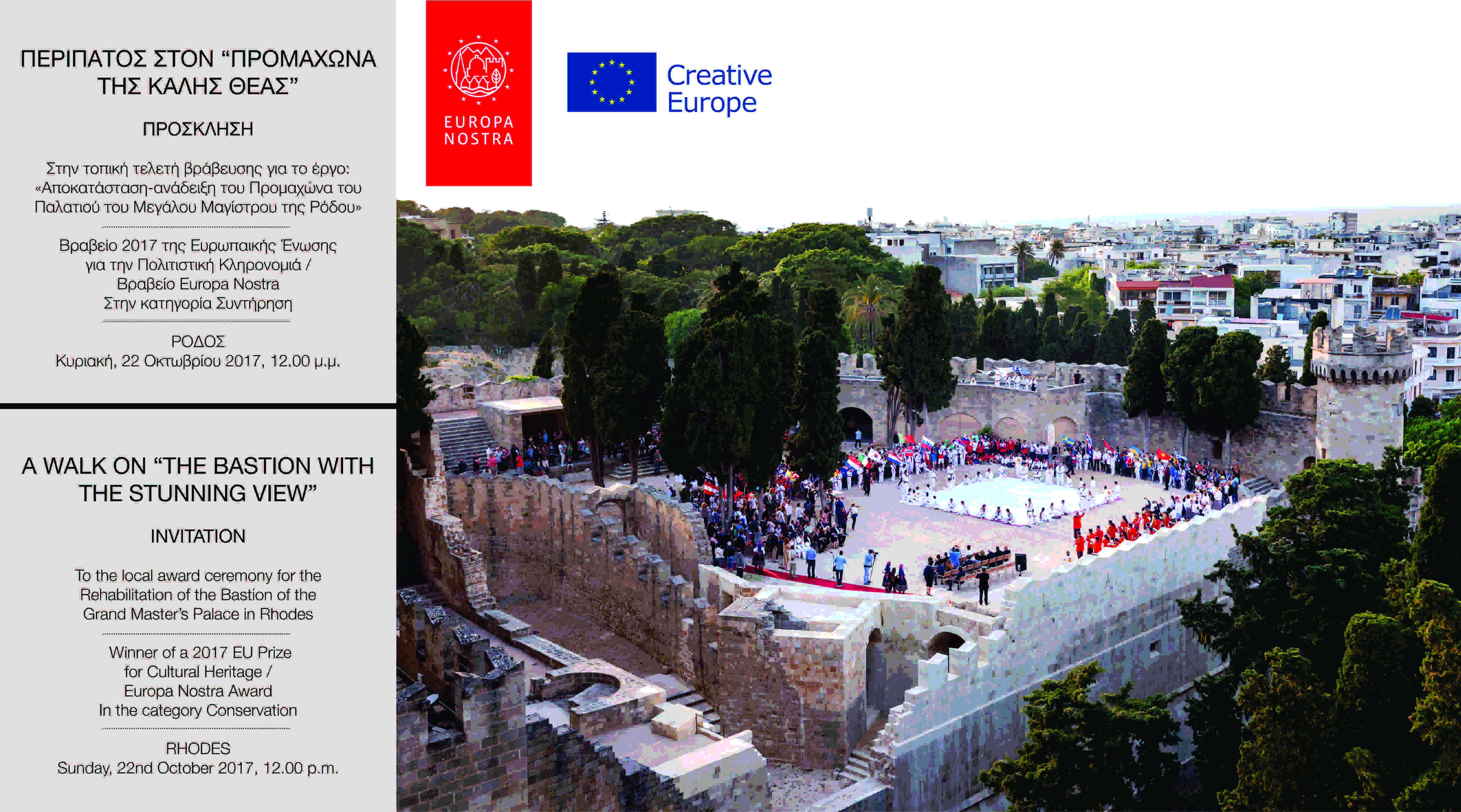 Η Εφορεία Αρχαιοτήτων Δωδεκανήσου και η Υπηρεσία Νεωτέρων Μνημείων και Τεχνικών Έργων Δωδεκανήσου, διοργανώνουν το Σάββατο 21 και την Κυριακή 22 Οκτωβρίου, διήμερο εκδηλώσεων για την απόδοση του Προμαχώνα του Παλατιού του Μεγάλου Μαγίστρου στο κοινό, με αφορμή την βράβευση του έργου αποκατάστασης-ανάδειξης του με το σημαντικό βραβείο της Ευρωπαϊκής Ένωσης για την πολιτιστική κληρονομιά / Βραβείο Europa Nostra 2017.