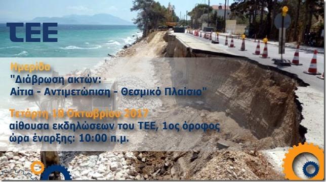 Τεχνική και επιστημονική ημερίδα για τη διάβρωση των ακτών διεξάγεται αύριο Τετάρτη στο ΤΕΕ. Η διάβρωση των ακτών είναι ένα πρόβλημα που αντιμετωπίζουν δεκάδες περιοχές της χώρας, πολλές μάλιστα ιδιαίτερα έντονα, και οι επιπτώσεις του αυξάνονται με το πέρασμα του χρόνου.