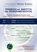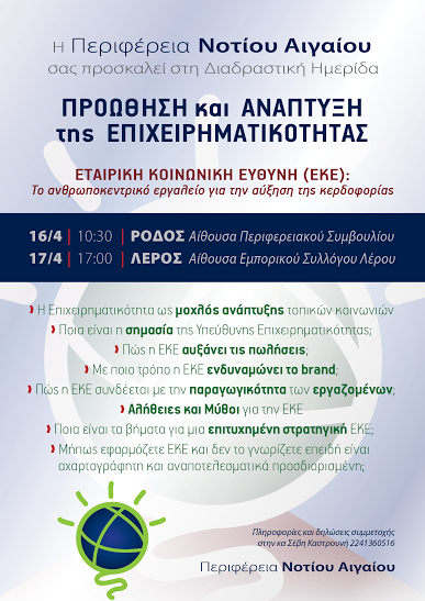 Μία επίκαιρη όσο ποτέ διαδραστική διημερίδα διοργανώνει η Περιφέρεια Νοτίου Αιγαίου για την ανάπτυξη της επιχειρηματικότητας και κυρίως την προώθησή της. Βασικός πυλώνας της διημερίδας αποτελεί η ΕΚΕ που την τοποθετεί ως το ανθρωποκεντρικό εργαλείο για την αύξηση της κερδοφορίας των επιχειρήσεων.