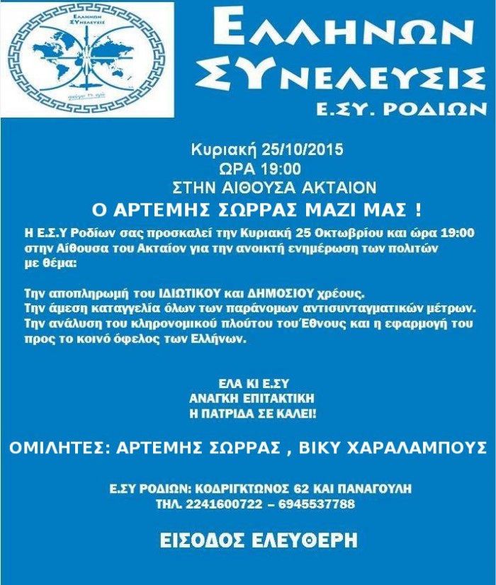 Για την εκδήλωση που διοργανώνει την ερχόμενη Κυριακή 25 Οκτωβρίου, στις 7:00 το απόγευμα στο Ακταίον η «Ελλήνων Συνέλευσις», στην οποία θα παραστεί και ο Πρόεδρος του πολιτικού φορέα κ. Αρτέμης Σώρρας, μίλησαν χθες στελέχη της, σε συνέντευξη τύπου που παραχώρησαν.