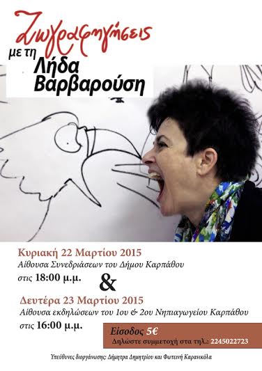 Με πολλή χαρά το Δημαρχείο Καρπάθου θα φιλοξενήσει την Κυριακή 22/03 στις 18:00(Αίθουσα Συνεδριάσεων του Δημοτικού Συμβουλίου) την πολύ ωραία πρωτοβουλία του 1ου και 2ου Νηπιαγωγείου Καρπάθου να καλέσει για τα παιδιά του νησιού μας την συγγραφέα και εικονογράφο Λήδα Βαρδαρούση. Την Δευτέρα 23/03 η συγγραφέας θα βρίσκεται στην Αίθουσα Εκδηλώσεων του Νηπιαγωγείου Πηγαδίων στις 16:00, ενώ παράλληλα, από 24-28 Μαρτίου θα λειτουργήσει Έκθεση Βιβλίου στο πλαίσιο της εν λόγω εκδήλωσης.