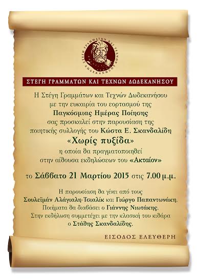Η Στέγη Γραμμάτων και Τεχνών Δωδεκανήσου γιορτάζοντας την Παγκόσμια Ημέρα Ποίησης, πραγματοποιεί εκδήλωση με τηνπαρουσίαση της ποιητικής συλλογής του Κώστα Ε. Σκανδαλίδη «Χωρίς πυξίδα» που θα γίνει στην αίθουσα εκδηλώσεων του «Ακταίον» το Σάββατο 21 Μαρτίου 2015 στις 7.00 μ.μ.