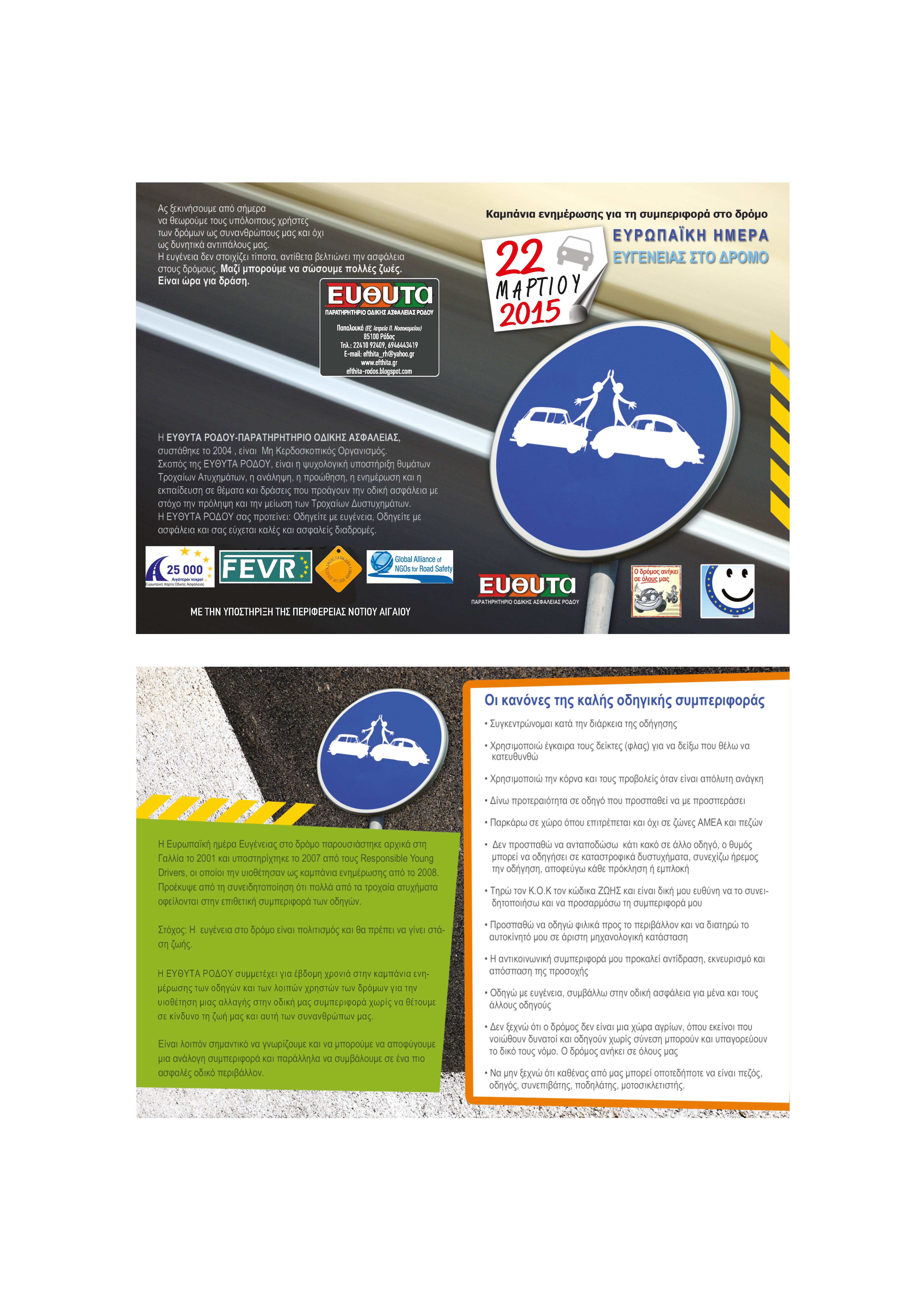 HΕΥΘΥΤΑ ΡΟΔΟΥ για 7η συνεχή χρονιά,και η Περιφέρεια ΝοτίουΑιγαίου συνδιοργανώνουντην Ευρωπαϊκή Ημέρα Ευγένειας στο Δρόμο, καμπάνια ενημέρωσης για τη συμπεριφορά στο δρόμο, παράλληλα με άλλες 27 Ευρωπαϊκές Χώρες.