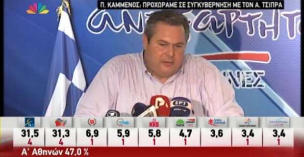 Στην Κουμουνδούρου προσανατολίζονται εκ νέου σε συγκυβέρνηση με τους ΑΝΕΛ - Τα κόμματα του Αλέξη Τσίπρα και του Πάνου Καμμένου εκλέγουν αθροιστικά 155 βουλευτές (145+10) - Τηλεφώνημα Τσίπρα με Φώφη Γεννηματά και Φώτη ΚουβέληΑκόμα και την ίδια κυβέρνηση, δηλαδή το σχήμα συνεργασίας ΣΥΡΙΖΑ-ΑΝΕΛ, μπορεί να δώσουν οι σημερινές εκλογές, με βάση τα αποτελέσματα από την καταμέτρηση των ψήφων. Ήδη, στον ΣΥΡΙΖΑ κινούνται προς τον σχηματισμό κυβέρνησης μόνο με τους Ανεξάρτητους Έλληνες, σύμφωνα με πηγές από την Κουμουνδούρου.